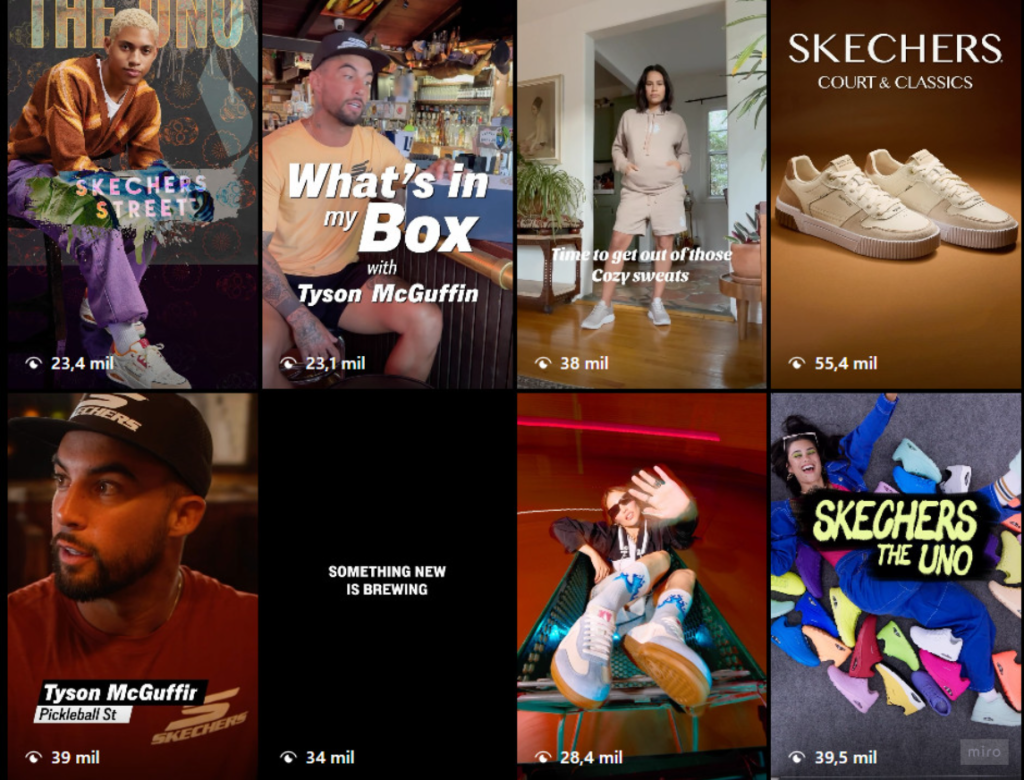 - Foco no Conforto e Acessibilidade: A Skechers se posicionou como a “The Comfort Technology Company”. Com um preço médio em torno de US$ 60 – significativamente abaixo dos US$ 150+ de muitos concorrentes – eles democratizaram o acesso a calçados tecnologicamente confortáveis.